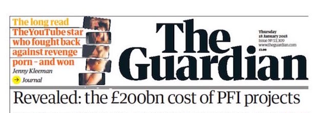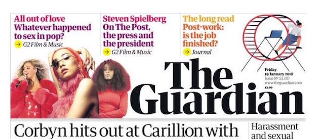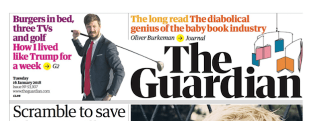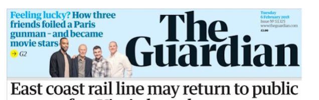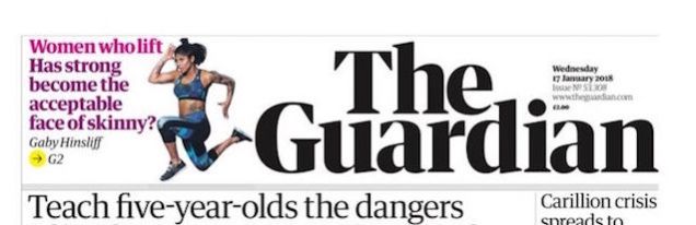 The words The Guardian have been lifted slightly to leave space between them and the four fine rules which separate the masthead from the splash headline below. The typography is restricted to two shades of blue and black.
