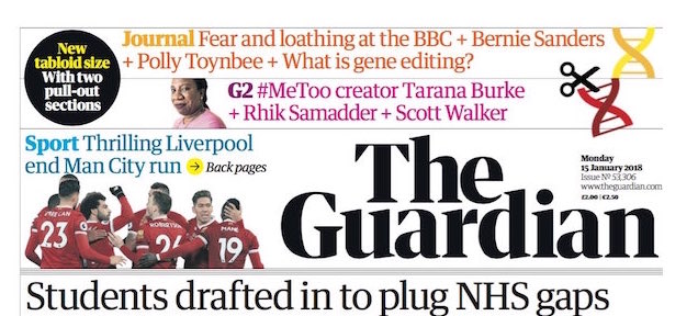 Two weeks into the Guardian’s redesign as a tabloid, it’s interesting to see how the masthead has evolved. Here are the mastheads from the first five days: