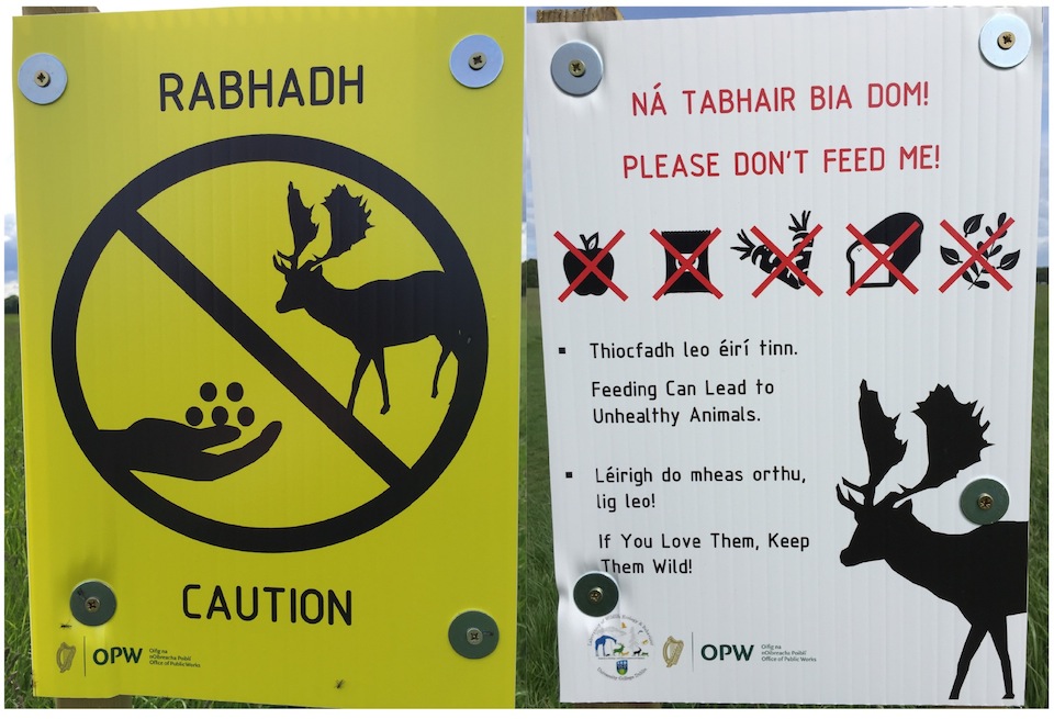 Yet more underwhelming signage in the Phoenix Park about feeding the deer. These ones look as though they were probably produced by staff in the Laboratory of Wildlife Ecology and Behaviour at University College Dublin, as they carry the Laboratory’s logo. It’s a shame that whoever designed them never went to the first year Information Design class which I used to run at UCD. (I see that this course is still being offered, by the way, although it is now under new management.)