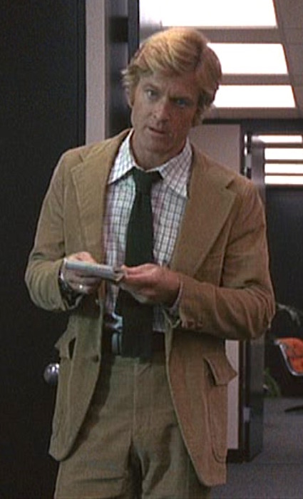 An article about Bob Woodward’s recent book about Donald Trump prompted me to search for references to Robert Redford’s portrayal of him in the 1976 film adaptation of All the President’s Men. In particular I was looking for something about the outfit most desired by any young man aspiring to be a hotshot investigative journalist, the tan corduroy suit which Redford wears for much of the film, seen in the screenshot above.