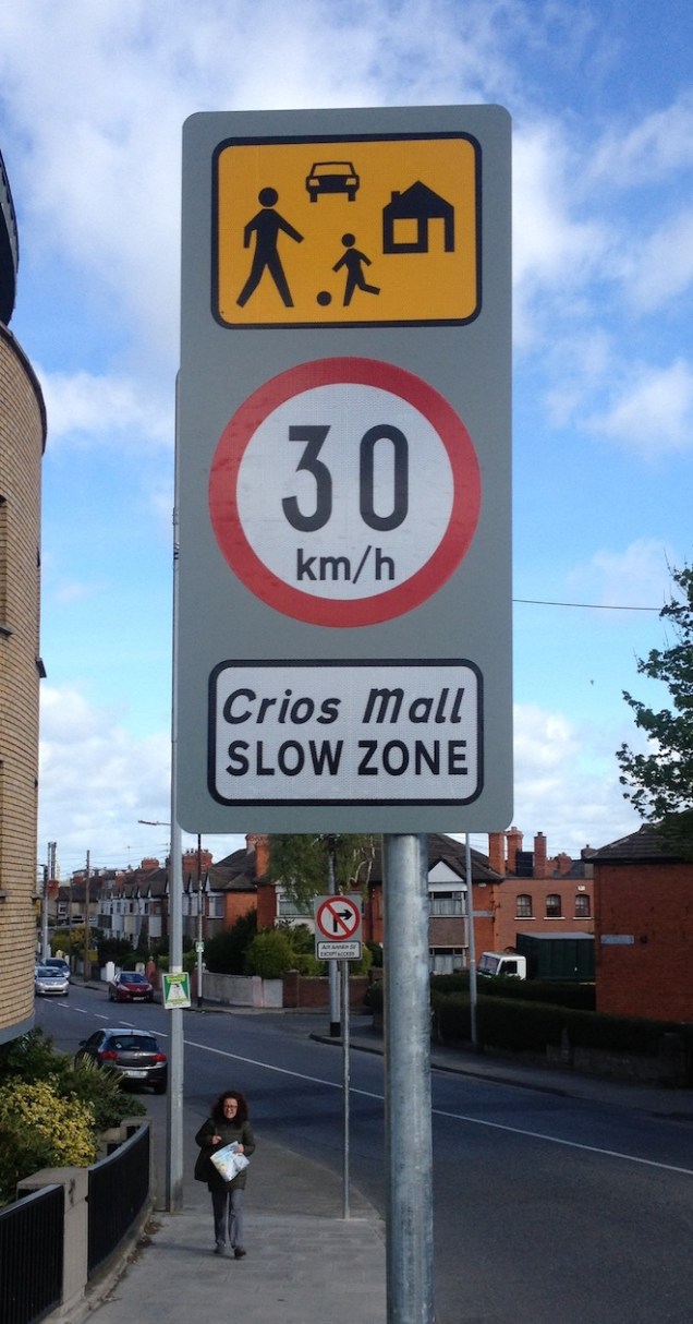 Dublin City Council has recently imposed a speed limit of 30kph in large parts of central Dublin – basically any street which is not regarded as a main artery. This is supposed to protect pedestrians and children at play. In order to explain this to the general public, the council has produced another one in its ongoing series of baffling signs, and spent a lot of money erecting them all over the city.