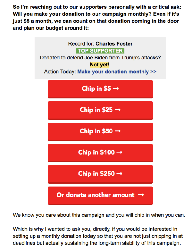 That list, which reportedly drove more than $500 million in donations in 2012, is now apparently at Biden’s disposal. He was a member of that ticket, giving him a leg up on other contenders.