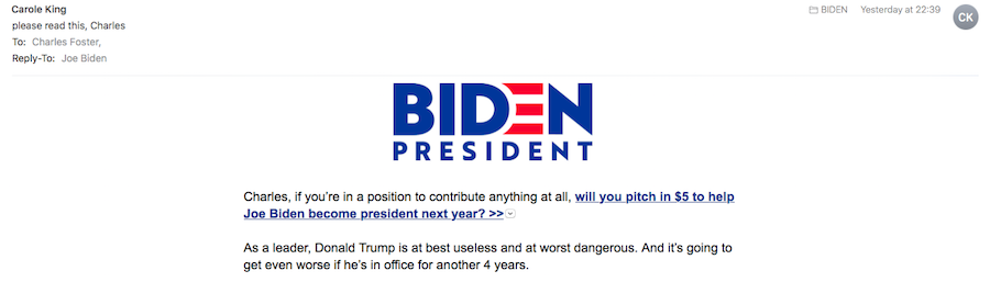 I’ve written before about how I got on Joe Biden’s email list, by signing up ten or more years ago for a personalised Christmas greeting from President Obama. Biden started his campaign a year and a half ago on Saturday, 23 April 2019, and the floodgates opened. By Election Day, Tuesday 3 November 2020, 556 days later, I had received 1641 emails from his people.