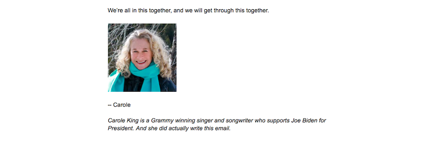 Over the months, I’ve got used to unlikely names popping up in my inbox. Here’s one from Carole King: