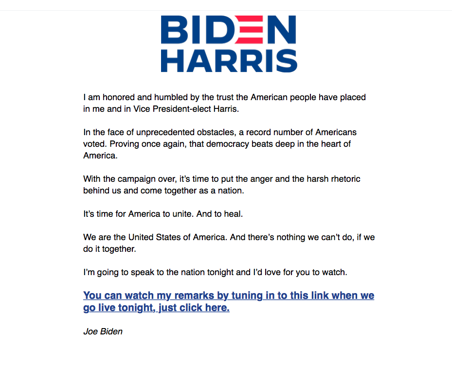 As a footnote, it’s worth pointing out that in all these thousands of emails the Biden and the wider Democratic campaign generally used language that was at least respectful. (“When they go low, we stay high”, as Michelle Obama is supposed to have said.) This can hardly be said of the opposition.