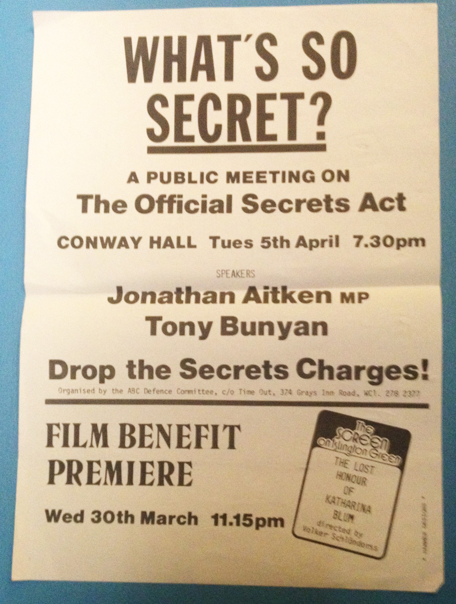 Some people might be surprised to see Jonathan Aitken’s name as a speaker at this meeting, given that he is most famous now for being convicted of perjury following the collapse of the libel case he brought against the Guardian in 1995. However, he had himself been on trial in 1971 for breaching the Official Secrets Act, along with the editor of the Sunday Telegraph, the newspaper itself and a retired army colonel who had been an observer in the Nigerian civil war in the late 1960s. All the defendants were eventually acquitted on all charges. (The best summary of the case that I could find online is actually from the New York Times.) The judge told the court that the Telegraph’s report did not contain ‘a word affecting our national security.’ and that the result should make the Government consider whether the broad terms of the act had ‘reached retirement age and should be pensioned off.’ The case against Aitken was brought by a Labour government and Attorney-General, and it was the same combination who brought the 1977 prosecution against Aubrey, Berry and Campbell. That might have been the party political reason for Aitken speaking in support of a campaign which had previously only been backed by left-wing Labour MPs (such as Neil Kinnock, Jo Richardson and Robert Kilroy-Silk(!)).